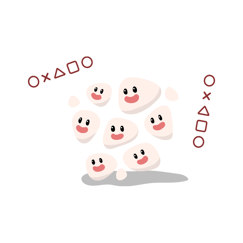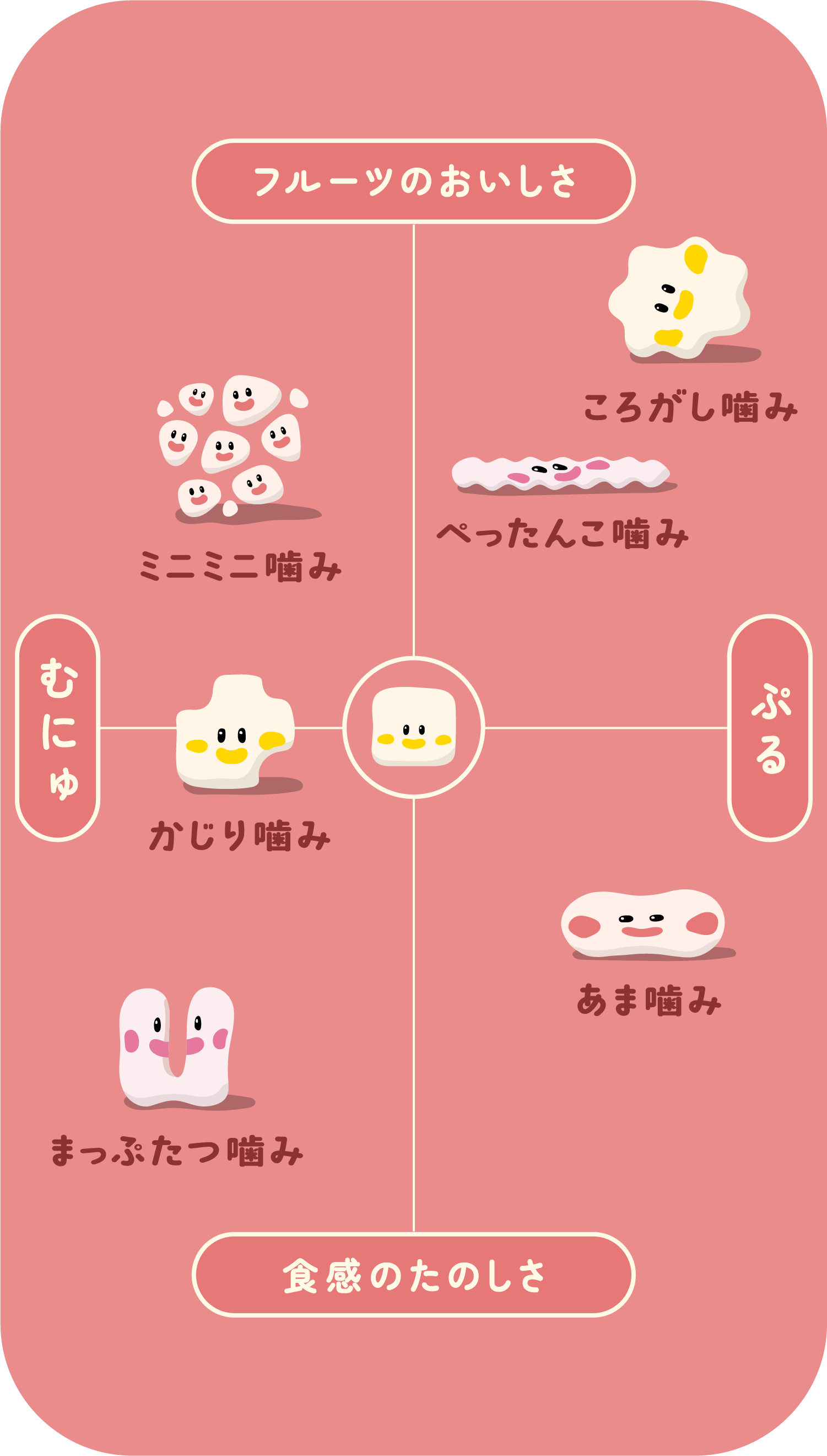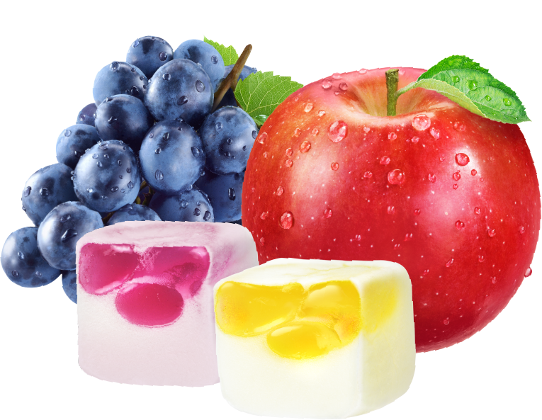 空気を含ませた"むにゅむにゅ食感"グミと、ゼリーのような"ぷるぷる食感"グミ。2つの組み合わせがきもちいい、独特の"むにゅぷる食感"をお楽しみください。